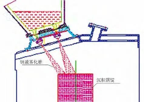 金屬粉末噴射成型工藝流程為:金屬液霧化—液滴高速飛行—液滴與沉淀器或模具碰撞變形及凝固成型。即首先將粉末加熱成熔融的金屬液,然后進行氣體霧化;在氣體射流的作用下,液滴加速飛行并迅速冷卻;當高速飛行的液滴在沉淀器內碰撞時,球形顆粒受沖擊作用而變成扁平狀,形成濺射片;通過沉淀器的冷卻作用顆粒迅速凝固,并在自熔性作用下積聚成型。